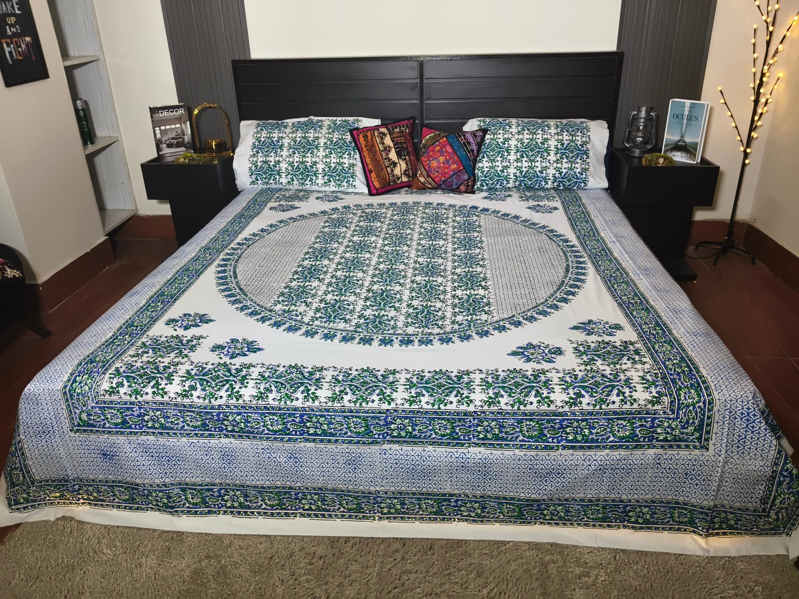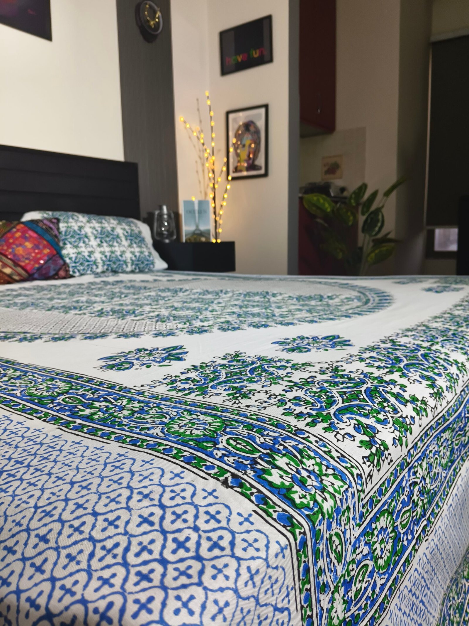 Designed with soothing blue and green block prints on a white base. This bedsheet radiates tranquility and grace. Each piece is hand-printed by skilled artisans and celebrating cultural heritage while offering modern comfort.